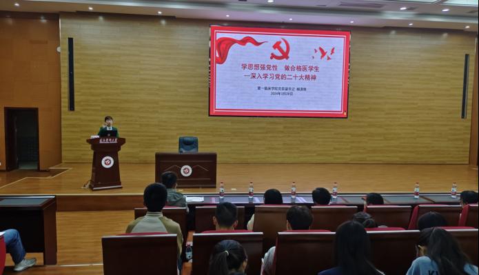 为深入学习习近平新时代中国特色社会主义思想,进一步提升支部师生党员的党性修养,教育青年员工在新征程上立志做有理想、敢担当、能吃苦、肯奋斗的新时代好青年,2024年3月29日晚19:00,第一临床公司党委副书记杨洪艳以“学思想强党性 做合格医员工--深入学习党的二十大精神”为主题讲授专题党课。本次党课在新浦校区道德讲堂进行,威廉希尔williamhill本科生第二党支部所有师生党员参与学习。