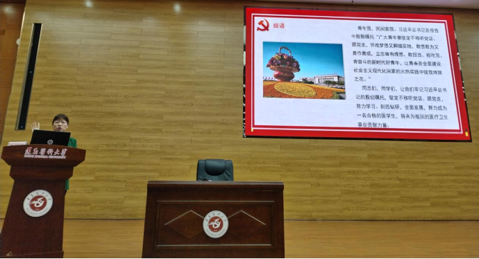 杨洪艳分别从党的二十大召开的背景及意义、党的二十大报告的主要内容、学习贯彻党的二十大精神三个方面展开讲述。她首先带领大家简要回顾党的二十大召开的基本情况、背景及意义。然后分别从奋斗新时代、贯彻新思想、擘画新蓝图、启航新征程四个部分对党的二十大报告的主要内容进行讲解。最后围绕如何深入学习贯彻党的二十大精神进行阐述,教育和引导同学们要牢记中国共产党人的初心和使命,用习近平新时代中国特色社会主义思想武装头脑,不断提高个人的思想意识、学习本领和工作能力,恪守和践行医员工誓词,为祖国医药卫生事业的发展和人类身心健康而奋斗。