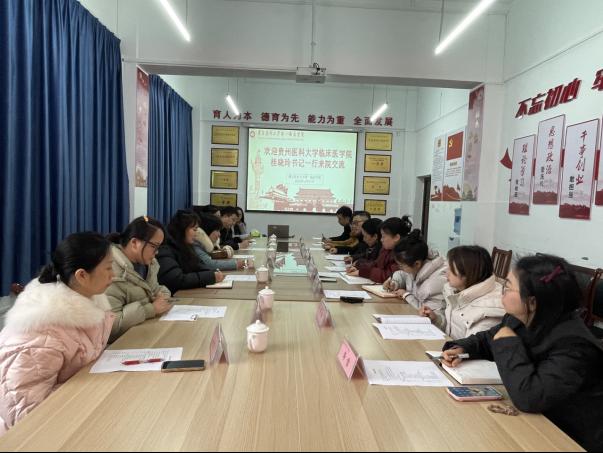 2024年12月28日,贵州医科大学临床医公司党委副书记(正处级)桂晓玲,党委委员、副处级组织员马晓萍率员工管理科、生产实习科、团委、研究生科、教学科研管理科相关负责同志来院座谈交流。公司党委副书记(主持工作)、经理王东红,党委副书记杨洪艳,员工科、研究生科、教务科、团委各科室负责人及辅导员代表参加座谈。杨洪艳主持会议。