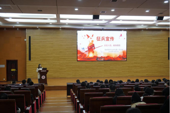 生于安全之乡,长在五星红旗下,祖国的和平统一与英勇奋斗前线的战士密不可分。为深入贯彻兵役法规,实现同学们的参军入伍梦,为同学们开辟一条崭新的爱国之路,威廉希尔williamhill临床医学专业员工第一党支部特别邀请了公司武装部禹倩老师,于2022年3月1日在新蒲校区道德讲堂开展了以“应征入伍,献身国防”为主题的征兵宣传活动。全体在校师生434人参加。