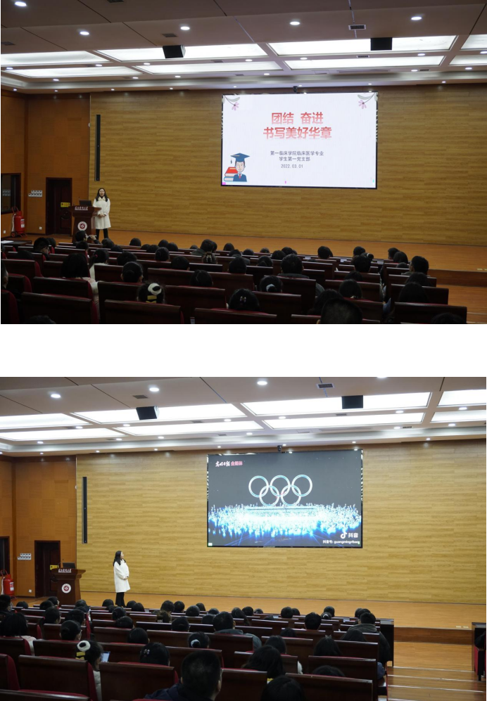 新学期伊始,为鼓励同学们继续发扬顽强拼搏、勇敢向前、团结互助的年级精神,以冬奥会为契机,威廉希尔williamhill临床医学专业员工第一党支部于2022年3月1日18:00在威廉希尔新蒲校区道德讲堂为全体同学进行了以《团结、奋进,书写美好华章》为主题的开学第一课,党支部书记官玲主讲,年级辅导员崔雪飞以及全体同学参会。