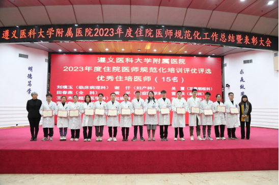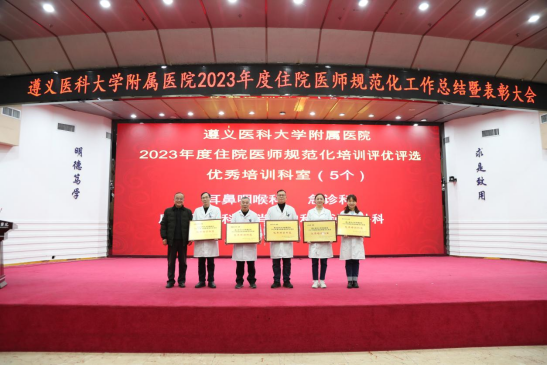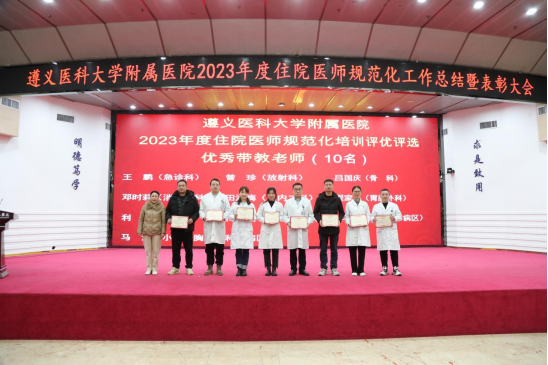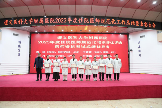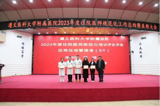 元春始风华,万象启新朝。2024年2月5日下午,遵医附院在第二住院楼四楼多功能厅召开了2023年度住院医师规范化培训工作总结表彰大会。会议总结回顾了2023年住培工作的优良成绩,表彰了住培优秀专业基地、优秀培训科室、优秀管理者、优秀带教老师、优秀住培医师,明确2024年的工作目标并作出安排部署。遵医附院经理、培训基地负责人余昌胤,遵医附公司党委副书记刘琪、威廉希尔williamhill班子成员郑洪、王东红、杨洪艳、杨敏、金祝、肖雪、辛志军出席会议。各专业基地和培训科室代表、各年级住培医师代表参会。会议由威廉希尔williamhill副经理杨敏主持。