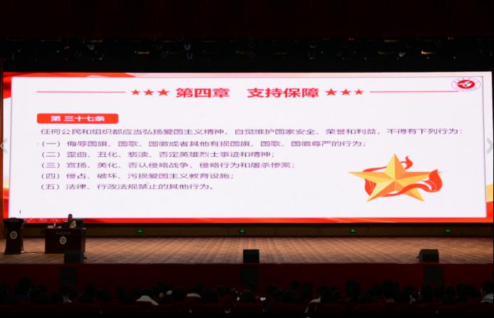 王东红以什么是爱国主义、爱国的基本要求有哪些两个问题开篇,引经据典,以岳飞精忠报国、林则徐虎门销烟两则故事引入“爱国”主题。接着带领同学们一起全文学习《中华人民共和国爱国主义教育法》,包涵《中华人民共和国爱国主义教育法》的立法经过、制定意义等。她重点向同学们解读了《中华人民共和国爱国主义教育法》中第一章第六条关于爱国主义教育的主要内容(共9条)以及关于国旗、国徽、国歌、《中华人民共和国英雄烈士保护法》的内容。最后,王东红告知同学们:爱国就是要爱祖国的大好河山;爱自己的骨肉同胞;爱祖国的灿烂文化;爱自己的国家。因为有国才有家,“家是最小国,国是千万家”。