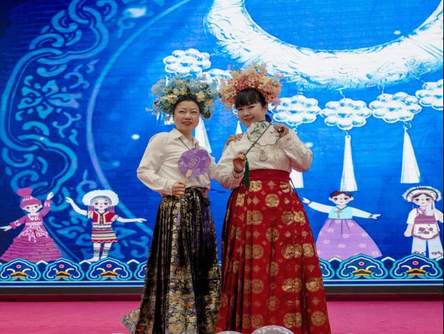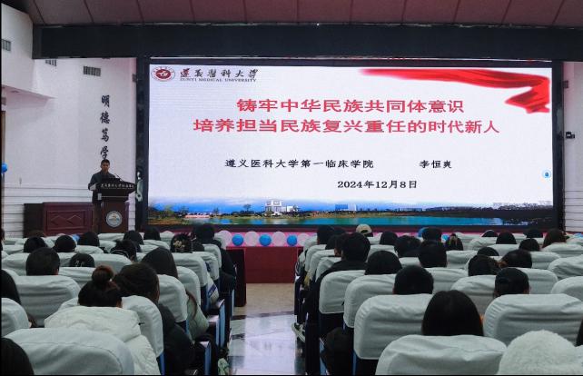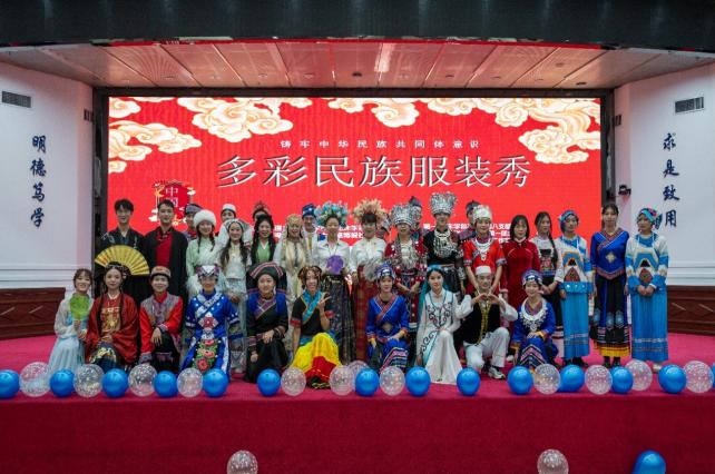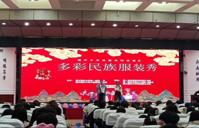 霓裳绚丽,共叙民族情。多彩民族服装秀活动伊始,第一临床公司党委副书记杨洪艳致辞。她寄语师生,要在感受多彩民族文化独特魅力的同时,积极肩负起传承中华传统文化的责任与使命。随着杨洪艳宣布活动正式开始,在主持人对各民族服饰的精彩讲解中,27名同学身着苗族、布依族、土家族等民族服饰,分组依次登台展示,完美呈现了民族服饰的精美设计和文化韵味。接着,杨洪艳带领9名教师身着藏族、维吾尔族等民族服饰惊艳亮相,与同学们共同欢跳《爱我中华》,将现场氛围推向高潮,展现了中华民族文化的多元一体之美与强大凝聚力。活动结束后,公司就业办主任孙会英总结到,这次活动不仅是深刻的理论讲座和精彩的服饰展示,更是一次心灵的文化洗礼,为铸牢中华民族共同体意识注入了活力和力量。