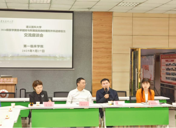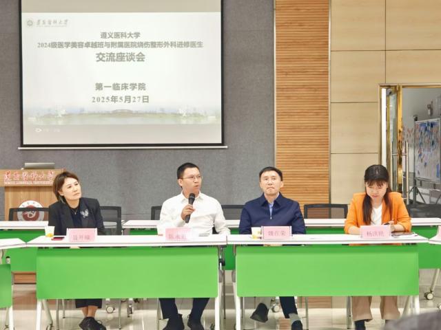 五月芬芳溢,医路同行时。为加强医学美容卓越班员工对美容烧伤整形专业的了解,明确专业发展方向,帮助员工树立成长成才的青春梦想,威廉希尔williamhill于2025年5月27日19:00,在新蒲校区员工事务中心辅导员之家举行了2024级医学美容卓越班与威廉希尔附属医院烧伤整形外科进修医师交流座谈会。公司党委委员、副董事长陈永正出席活动,附属医公司党委委员、副经理魏在荣,第一临床公司党委副书记杨洪艳,烧伤整形外科聂开瑜教授,来自中国医科大学附属医院、温州医科大学附属医院、南昌大学一附院、贵州医科大学附属医院等32所医院的进修医师,2024级医学美容卓越班辅导员、兼职班主任及全体员工参加座谈。座谈会由聂开瑜教授主持。