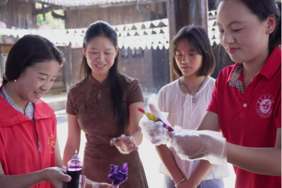 仡佬族扎染如一抹灵动的文化印记,牵引着实践团队探索的脚步。在工作人员李雪莲老师的介绍下,队员们走进古寨非遗染坊体验馆,向扎染传承人杨旭玲老师潜心研学:从草木灰水脱浆的布料预处理到“打结法”“折叠扎”等精巧捆扎技艺,再到蓝草天然染色的自然之法,每一步都流淌着民族生活的智慧。队员们携手完成捆扎、浸染、拆线、晾晒过程,于蓝白交织的纹样间,触摸“预设与偶然”碰撞的独特美感,体悟“随形就势、因扎得纹”的创作哲思。等待成果的间隙,队员们与杨老师深聊传承现状、学艺方向,读懂“匠心”与医学精神的共通内核,让这门古老技艺在联合实践中绽放新生机。