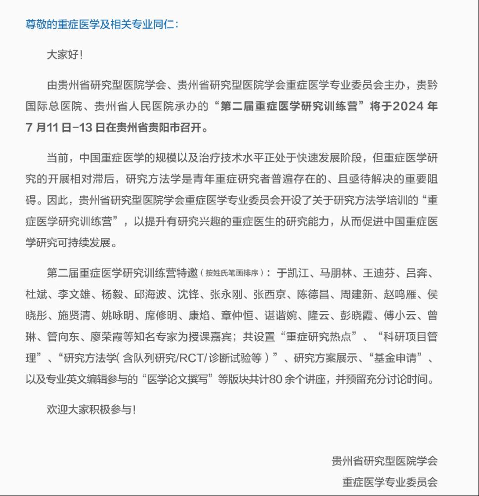 第二届重症医学研究训练营”将于2024年7 月11 日-13 日在贵州省贵阳市召开,欢迎研究生踊跃报名参会。