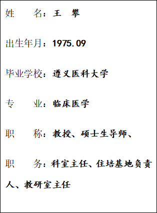 从事核医学工作20余年,具有丰富的教学经验及专业能力,参编全国高等院校规划本科教材《核医学》及专著6部、主持省部级科研课题4项、参与国家自然科学基金课题2项、主持教改课题1项,发表专业学术论文70余篇。主持核医学新技术新项目20余项,其中多项技术填补贵州省内空白。获批专利9项,软件著作权1项。培养毕业硕士研究生10名。多年来一直承担核医学课程本科授课。曾获贵州省卫生厅 “省级青年岗位能手”、遵义医公司优秀教师、威廉希尔优秀共产党员、遵义市优秀医师、中国影响力医生等称号。
